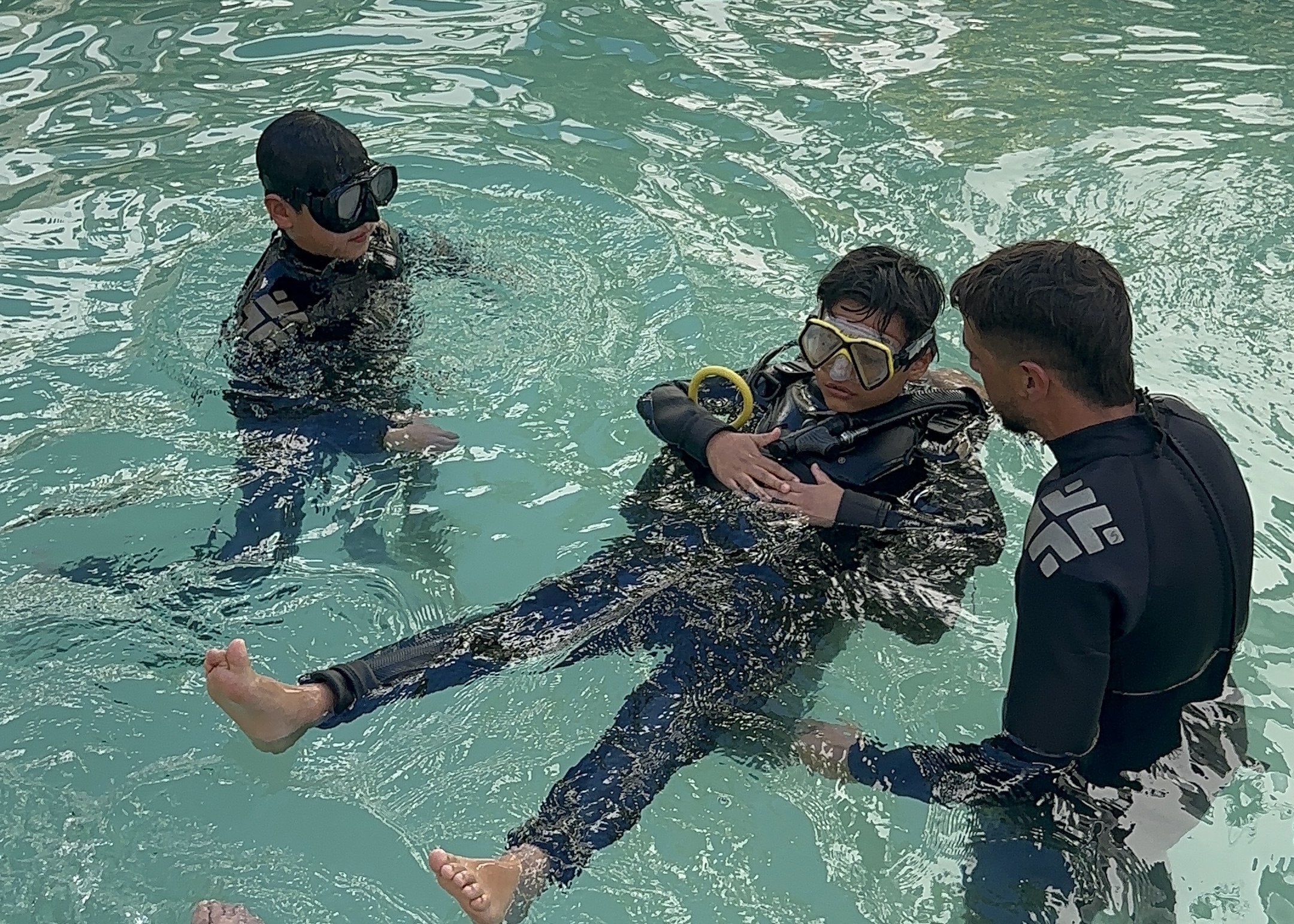- Briefing & Gear Setup – We start with a short, fun explanation of scuba gear and underwater safety. Kids are fitted with child-sized dive equipment and prepped for their AquaMission!