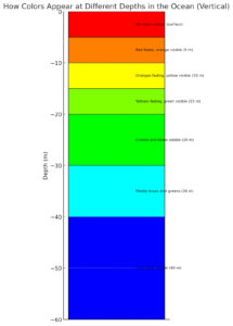 As you go deeper, light is absorbed by the water. Different colors disappear at different depths. Red fades first, followed by orange and yellow. Green holds on longer, and blue stays visible the longest. That is why everything starts to look more blue or green as you descend.
